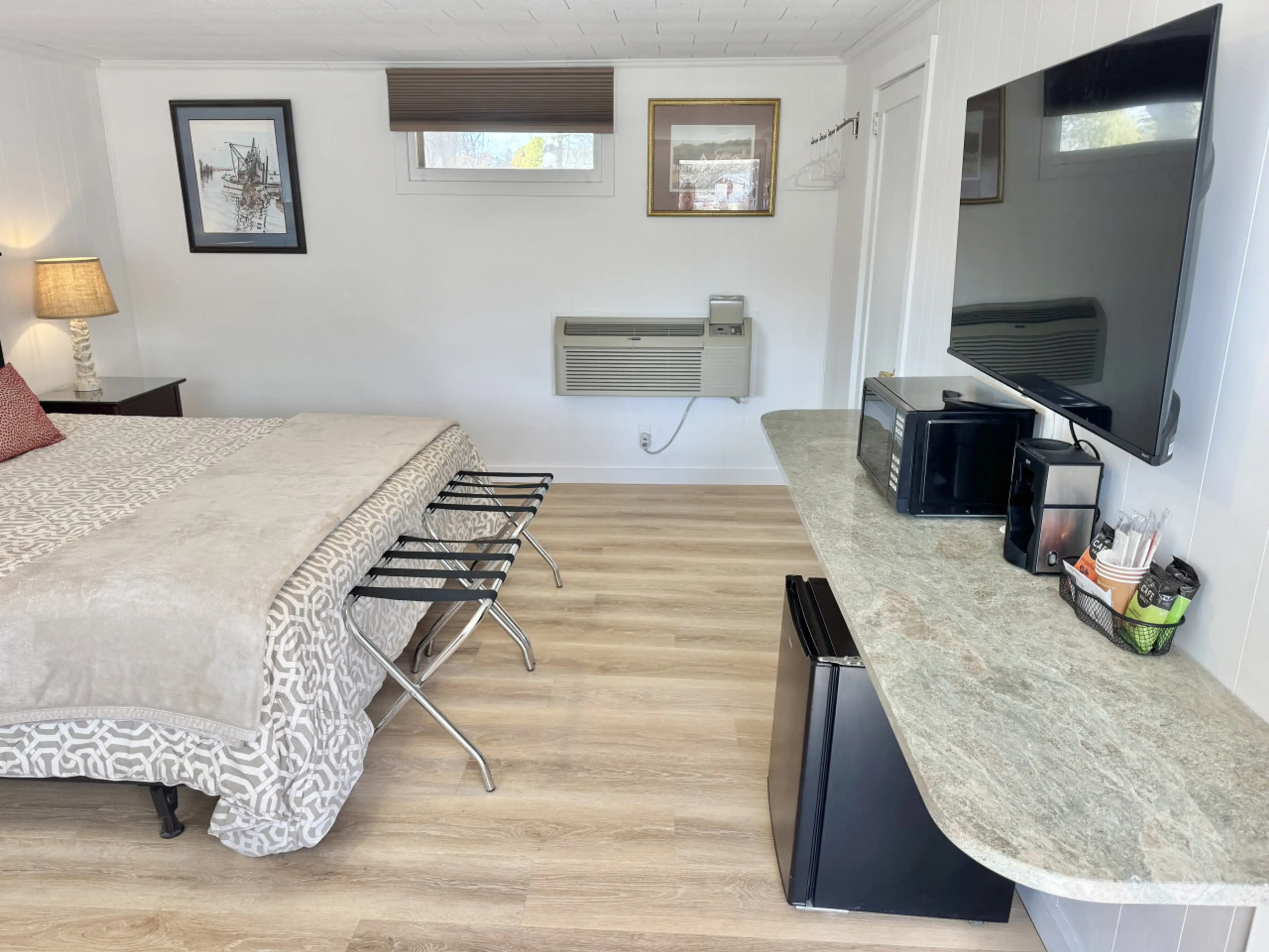 This comfortable king room features a full bathroom, dedicated parking, and amenities including a microwave, refrigerator, free wi-fi, and a Smart-TV. Also included is a large common greenspace with lawn chairs, propane grills, and a private dog-park. An ocean beach, several restaurants, a general...