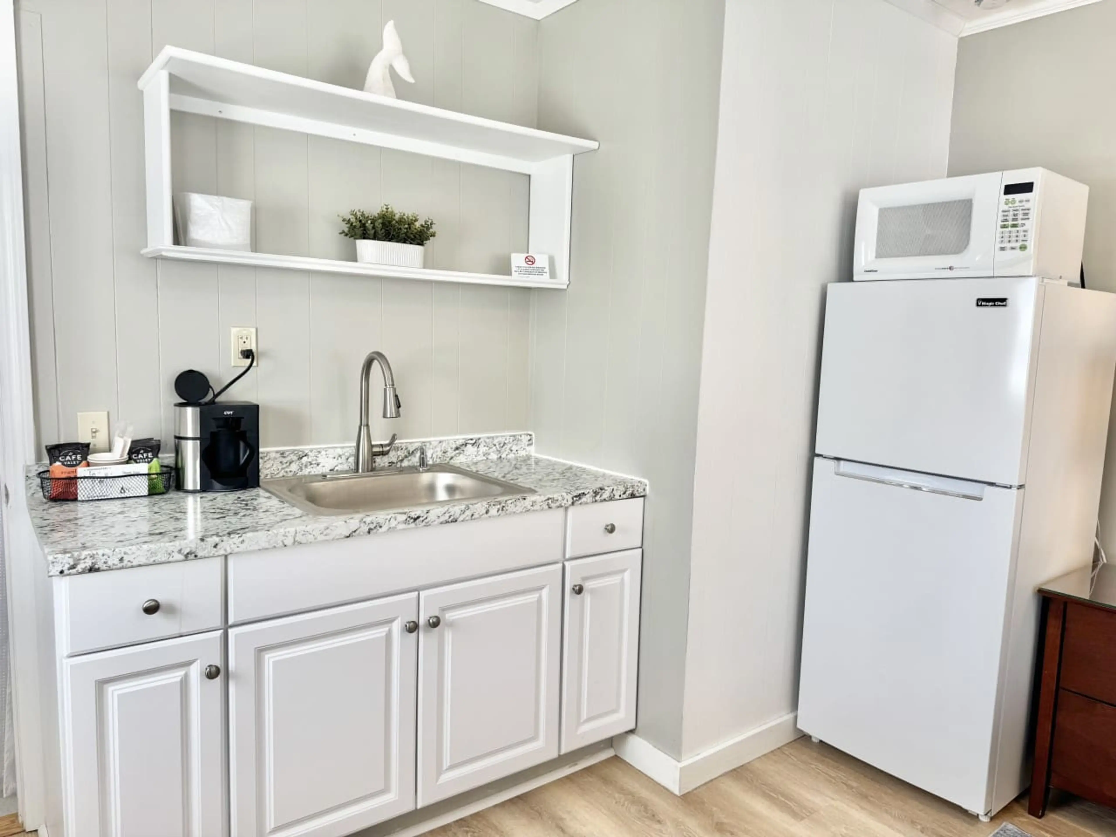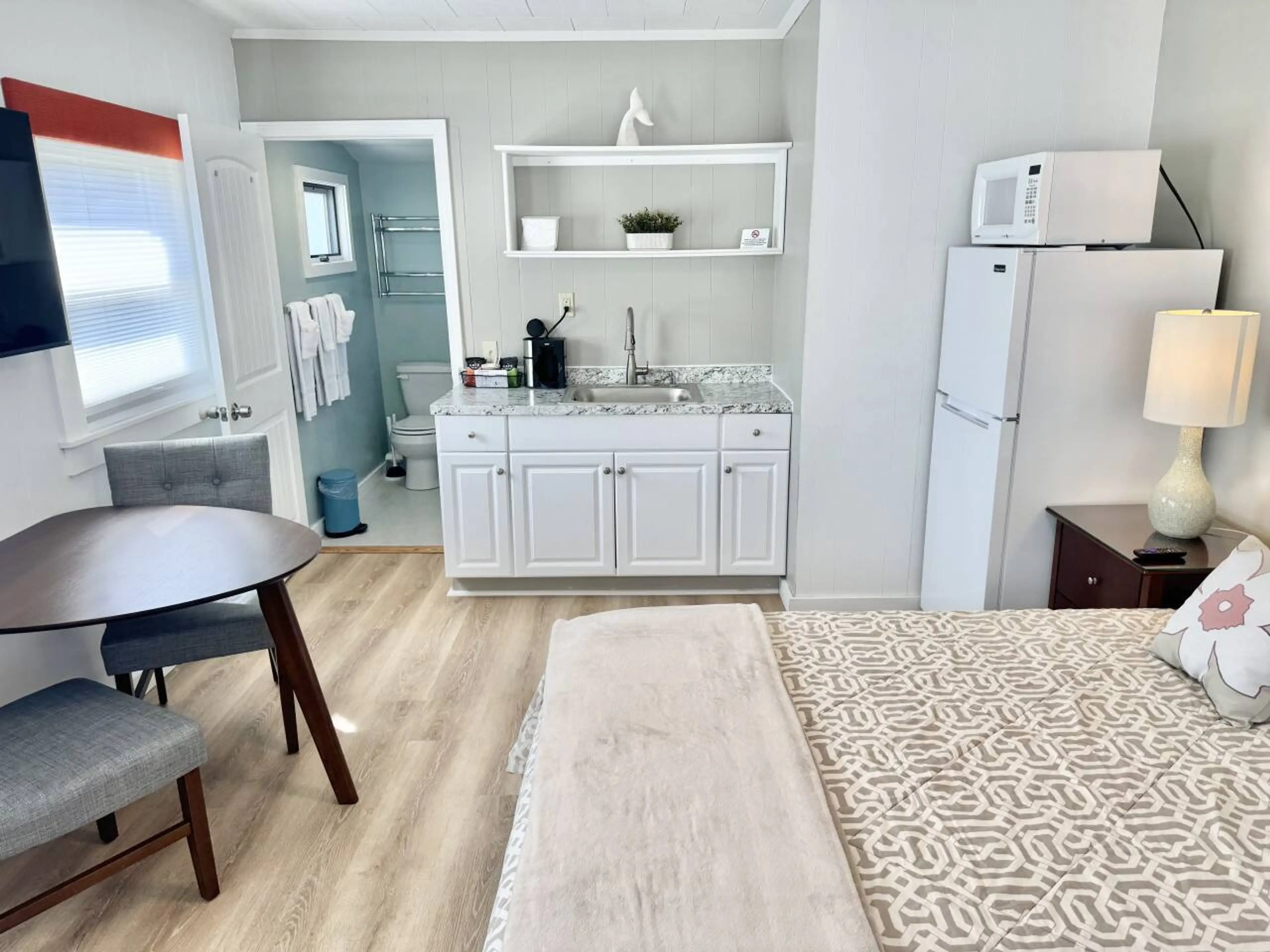 This comfortable, oversized suite with king bed features a full bathroom, dedicated parking, and amenities including a microwave, refrigerator, free wi-fi, and a Smart-TV. Also included is a large common greenspace with lawn chairs, propane grills, and a private dog-park. An ocean beach, several r...